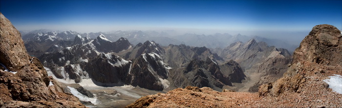 И снова в путь, все выше и выше. Идем по узкому ущелью к подножию пятитысячника — высочайшей вершины Фанских гор (и всей системы Памиро-Алай). Чимтарга (5487 м) лишь чуть-чуть уступает Эльбрусу.