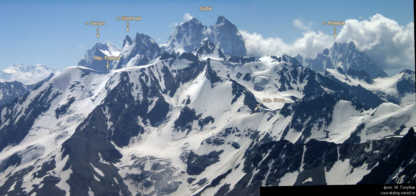 Шан (4451м) — потрясающе красивая, но малоизвестная гора. Хотя каждый, кто был в Казбеги, видел ее и поражался мощью длиннющей многоглавой вершины, ведь она расположена прямо напротив Казбека, с другой стороны долины.