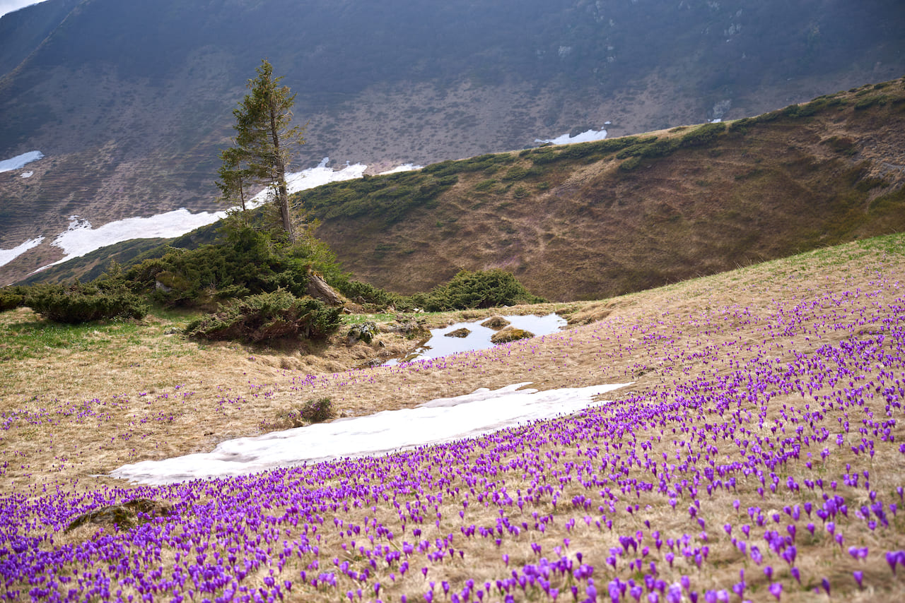 Невероятные фото с крокусами можно сделать в Мармароських горах. К сожалению, во время войны пограничные районы Карпат закрыты для посещения. Однако те, кто может пересекать государственную границу, могут отправиться с нами в поход за крокусами на гору Фаркеу.