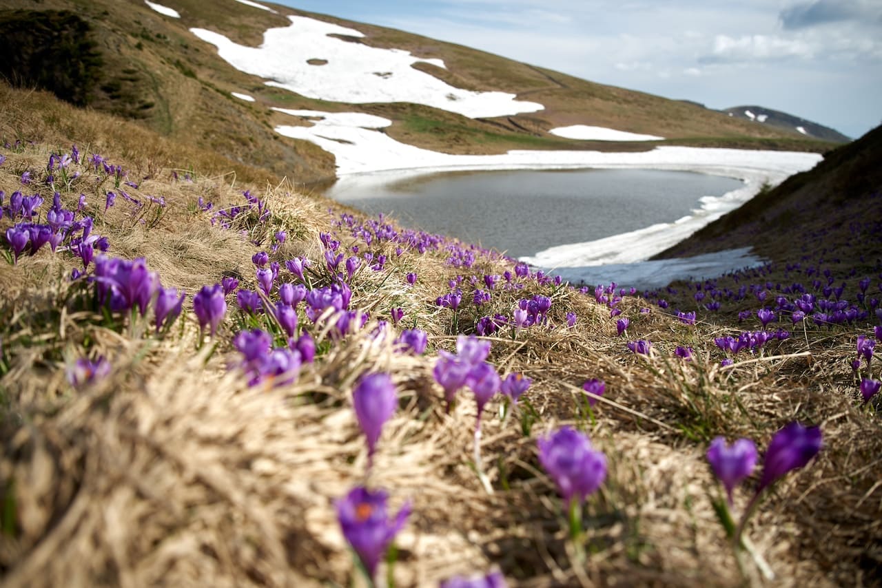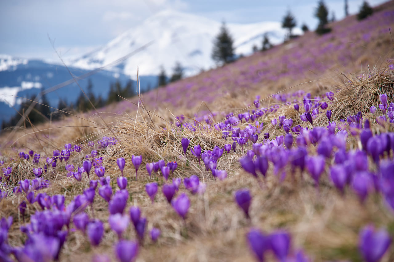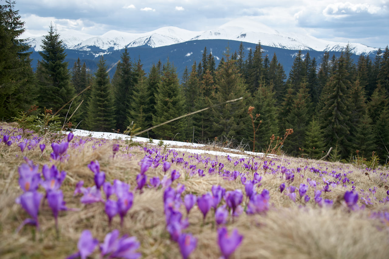 Невероятные фото с крокусами можно сделать в Мармароських горах. К сожалению, во время войны пограничные районы Карпат закрыты для посещения. Однако те, кто может пересекать государственную границу, могут отправиться с нами в поход за крокусами на гору Фаркеу.