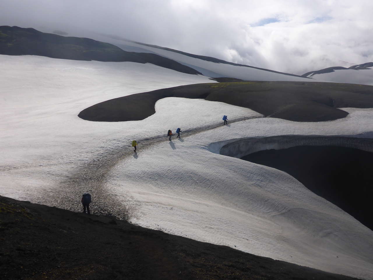 Поход в Исландию ежедневно преподносит нам удивительные открытия. Сегодня мы пойдем через лавовую пустыню, усеянную черным песком. Лишь редкие кустики скудной растительности и ярко-зеленые склоны гор на горизонте будут немного смягчать этот суровый пейзаж.