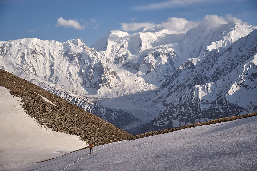 Начинаем треккинг в Rakaposhi Bace Camp. Сначала тропа петляет между скал и рододендронов, потом выводит на ледник. Прямо перед нами неприступной стеной возвышаются Пик Диран (7100м) и Ракапоши (7788м), далеко внизу раскинулась долина Минапин, окруженная хребтами Каракорума. Ледник, по которому мы идем, испещрен трещинами, реками и каменными грибами, он грохочет, блистает на солнце и, кажется, живет своей таинственной жизнью. Вокруг лишь горы и тишина, туристов нет, да и у альпинистов сезон практически подошел к концу. Красота принадлежит только нам… в такие моменты особенно остро ощущаешь себя ничтожной песчинкой, затерянной в огромном мире.