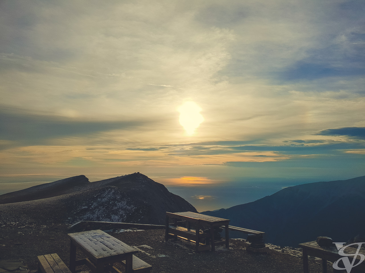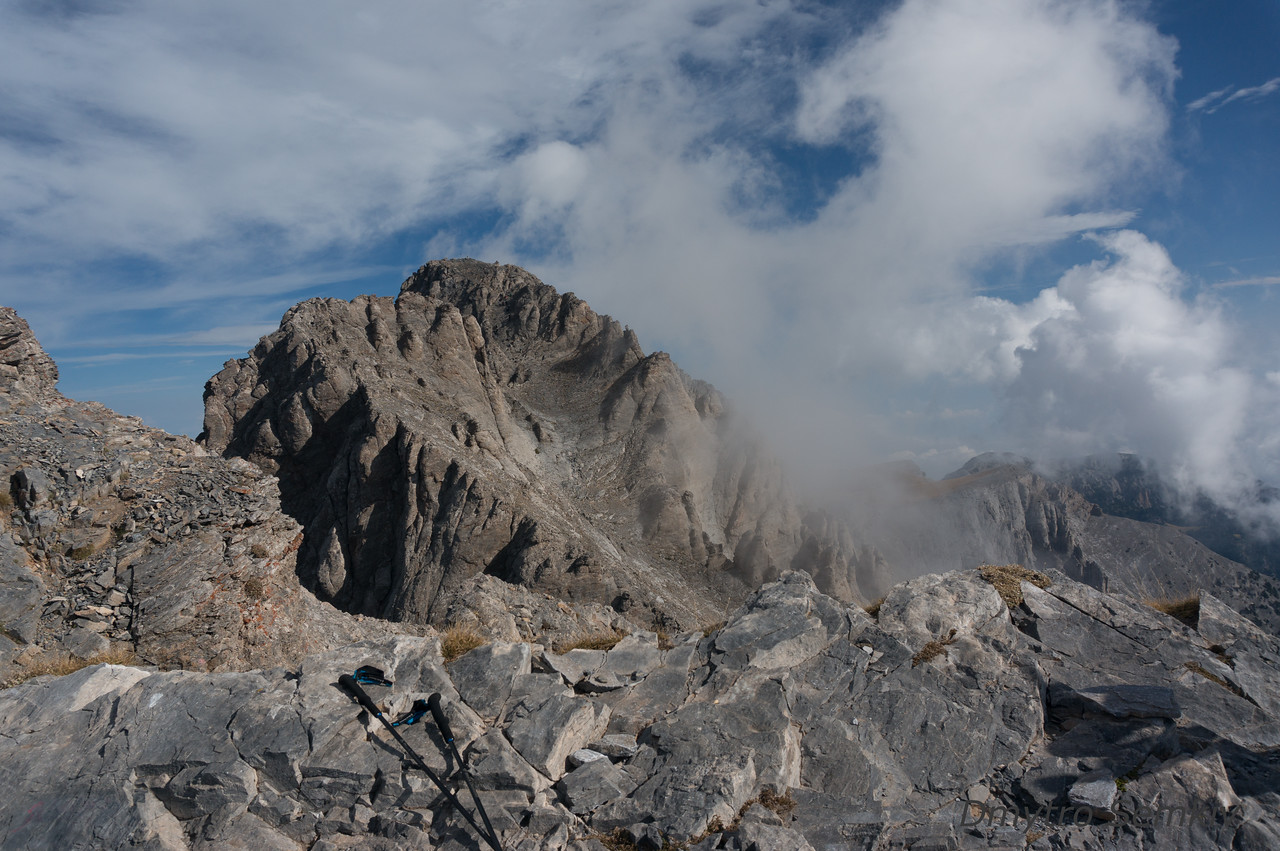 После отметки 2400м пропадает лес, а выше 2700м остается только голый камень. Выходим на Сколио, откуда впервые увидим дом греческого Пантеона во всей красе и величии. На склоне Стефани есть исполинский круглый котлован, который называют Трон Зевса. Не потому ли древние поверили, что Олимп — не простая гора?