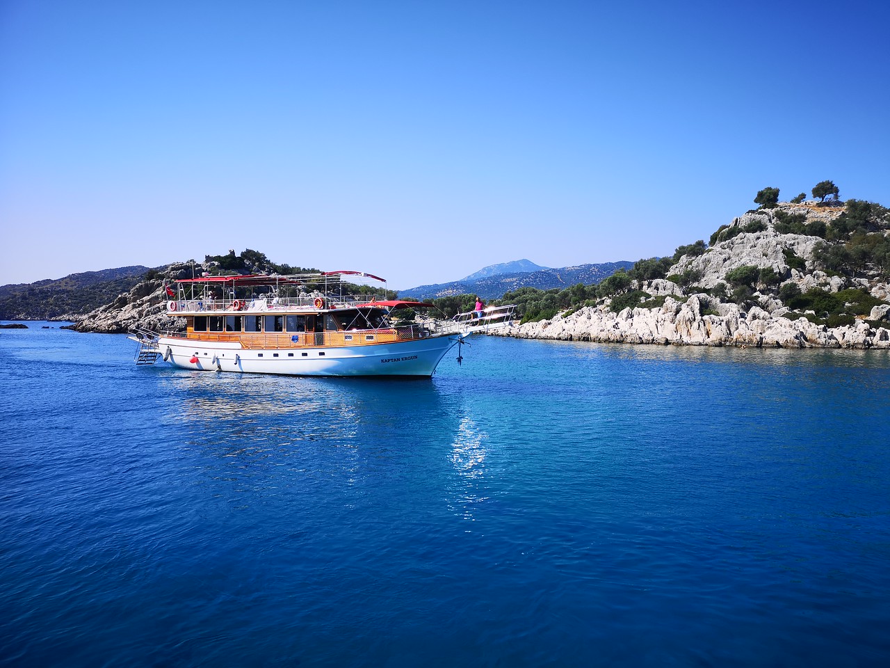 Йдемо на причал, де чекає наша яхта, і відправляємося на морську прогулянку. Оглянемо затоплені руїни Сімени на острові Кекова — вода тут настільки прозора, що затоплені фундаменти прекрасно видно з борта яхти.