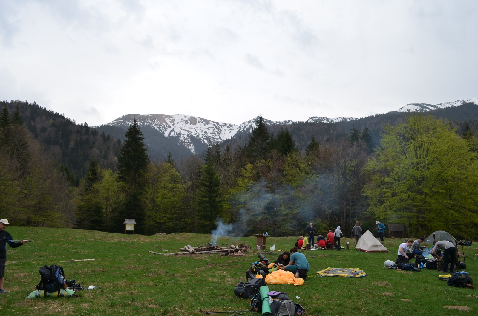 До вершини гори Попа-Івана від табору трохи більше 2 км по прямій, але крутий підйом, так що навантаження Вам вистачить))). Піп-Іван прекрасний, особливо навесні, коли скелі та сніг сусідять зі свіжою зеленню. Це навіть не вершина, а величезний гребінь, що півколом обрамляє епічний льодовиковий цирк. З кожним поворотом стежки на вершину відкриваються нові види та обриви, і кожен крутіший за попередні. Друг, це найпрекрасніша гора України, і ти її побачиш! По хребту проходить кордон із Румунією, сфотографуємось у двох державах одночасно. Увечері спускаємось у наш табір на Лисичій полонині, якщо буде час/бажання, сходимо в лазню.