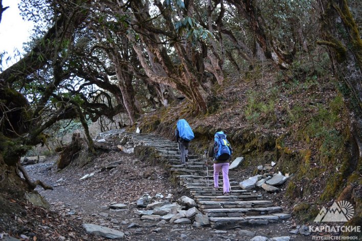 Продовжуємо набирати висоту. Наш трек до базового табору Аннапурни проходить через найбільший в світі рододендроновий ліс. Рододендрон тут не чагарниковий, як в Карпатах, а досягає розмірів справжніх дерев. Коли вони цвітуть, видовище воістину чудове: ніби на схили опустилися хмари всіх відтінків рожевого і бузкового… Приходимо в невелике селище Горепані (2860 м). Звідси відкривається вид на Дгаулахірі (8167 м) і Нілгірі Південну (6839 м).