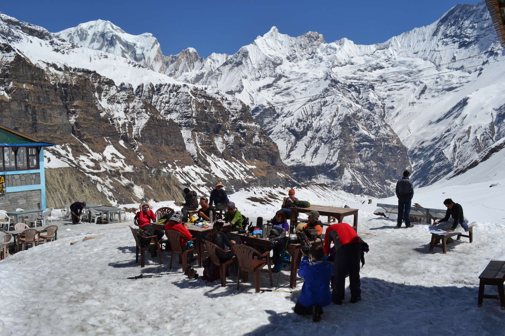 Щоб насолодитися красою Аннапурни, виходимо раніше. Відчувається легкий морозець – гарненько утеплимося. Речі залишаємо в лоджі, підемо до базового табору Аннапурни радіально і без рюкзаків. Підйом в АВС плавний, без крутих наборів висоти. Наш маршрут пролягає між вершинами Аннапурни і кожна з них – прекрасна. Намагаємося зберегти в пам’яті приголомшливий вид грізного восьмитисячника, милуємося льодовиками і слухаємо далекий гуркіт лавин і каменепадів. Ми досягли кінцевої мети треку. Обідаємо і починаємо спуск до табору Мачапучаре. Попереду чекає заслужений відпочинок і екскурсії!