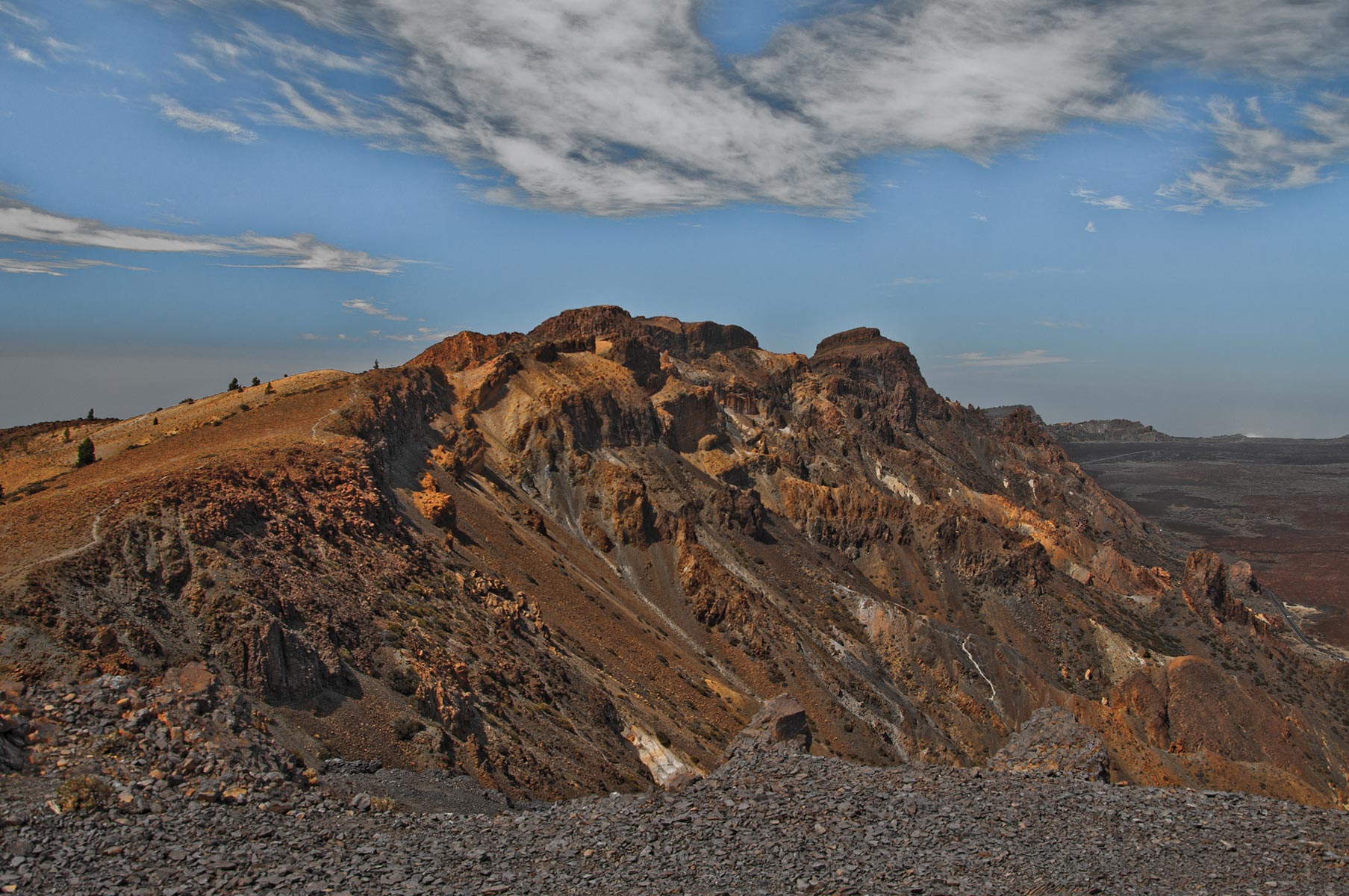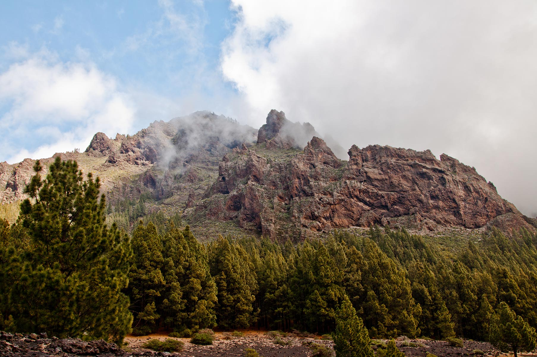 Їдемо до підніжжя Тейде, де розташована станція канатної дороги. У цій частині Тенеріфе ліс змінився на високогірний, більш посушливий, з мізерною рослинністю. В жерлі старого вулкана сфотографуємося з Лас Рокас де Гарсія (Roques de Garcia). Тут є «палець Бога», «Черевичок королеви”, “Верблюд”, “Ведмідь”. Напевно, найвідоміша – «палець Бога». Вона набула такої форми завдяки специфічному геологічному походженню і постійній ерозії, але тепер вже буквально розсипається.